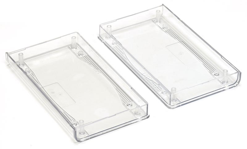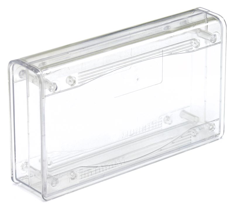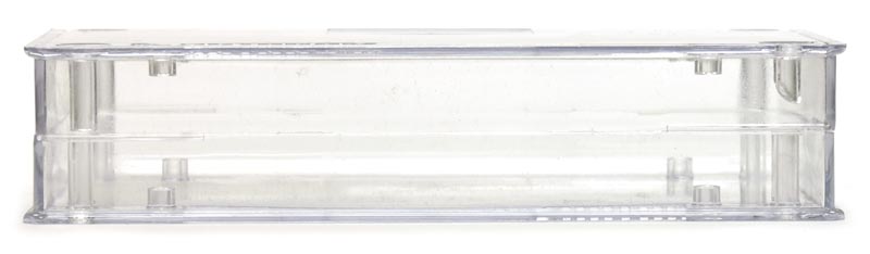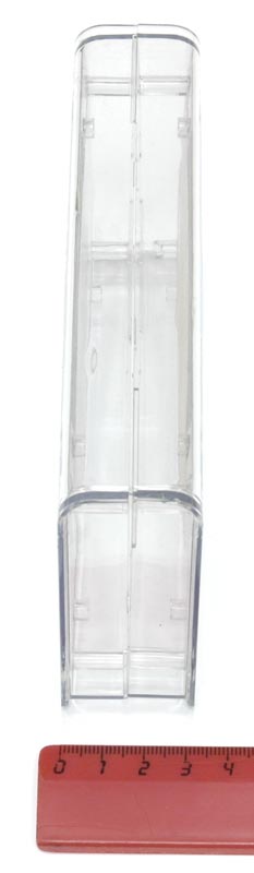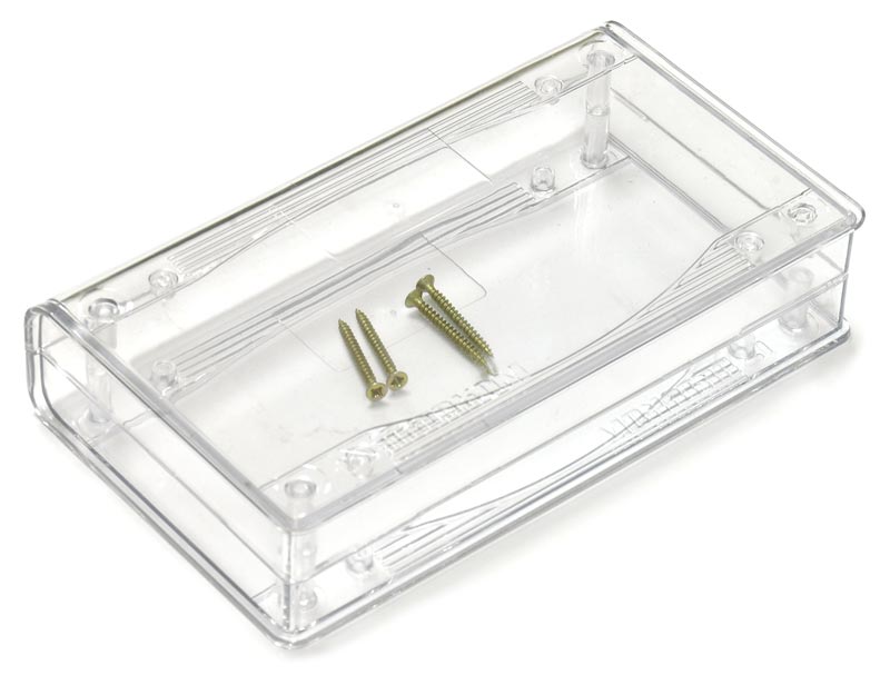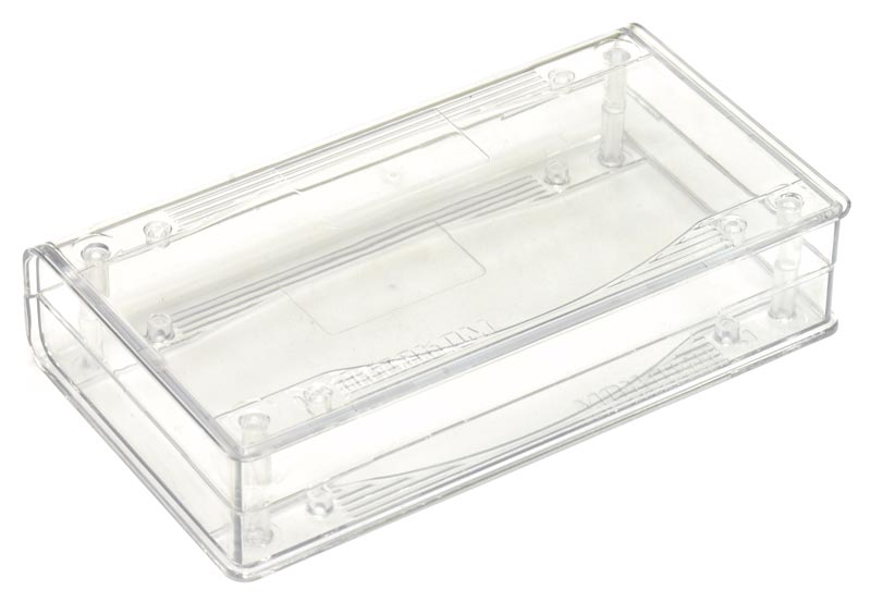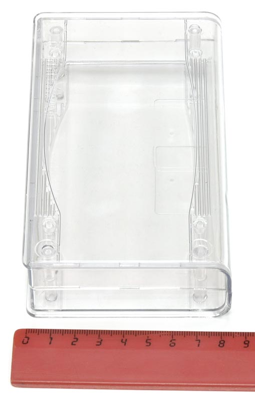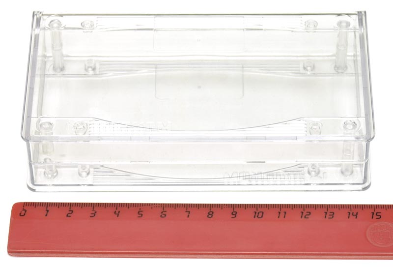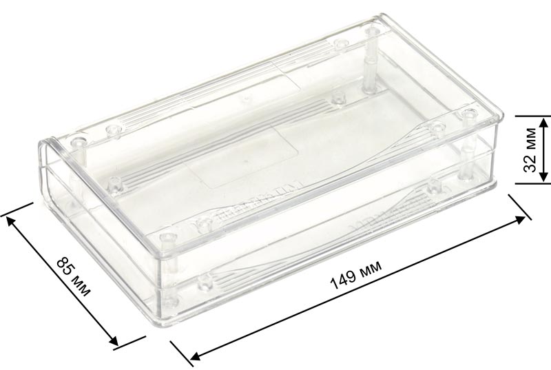 Пластмассовый прозрачный корпус для электронных устройств. Корпус состоит из двух половин, крепление - 4 самореза 2,5×25 мм (в комплекте). Внутри корпуса имеются опоры для крепления печатных плат. Габаритные размеры (ш × в × г) 149 × 32 × 85 мм. Во избежание царапин при транспортировке поставляется в защитной плёнке.