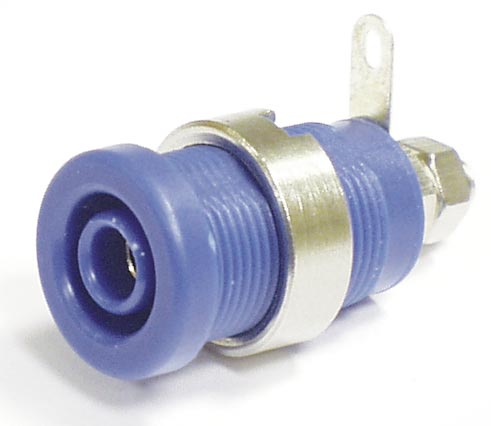 Гнездо внутренним диаметром 4 мм с двойной изоляцией, с контактным лепестком. Гаечное крепление и двойное гаечное соединением. Высота 23 мм, внешний диаметр 12 мм. Защика по CAT III, максимальный ток 25 А, максимальное напряжение 1000 В, контактное сопротивление не более 5 мОм. цвет синий