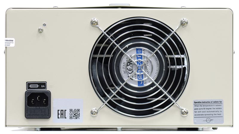В источнике питания АКТАКОМ APS-3610 реализована схема "интеллектуального" управления вентилятором. При включении источника питания APS-3610 вентилятор охлаждения не включается, как это обычно принято в подобных устройствах. Для управления работой вентилятора на внутреннем радиаторе установлен термодатчик, при нагреве которого включается вентилятор для охлаждения. При снижении температуры вентилятор отключается. Например, под нагрузкой 4,5 А, 40 В вентилятор включается через 5 минут, отключается через 2 минуты.